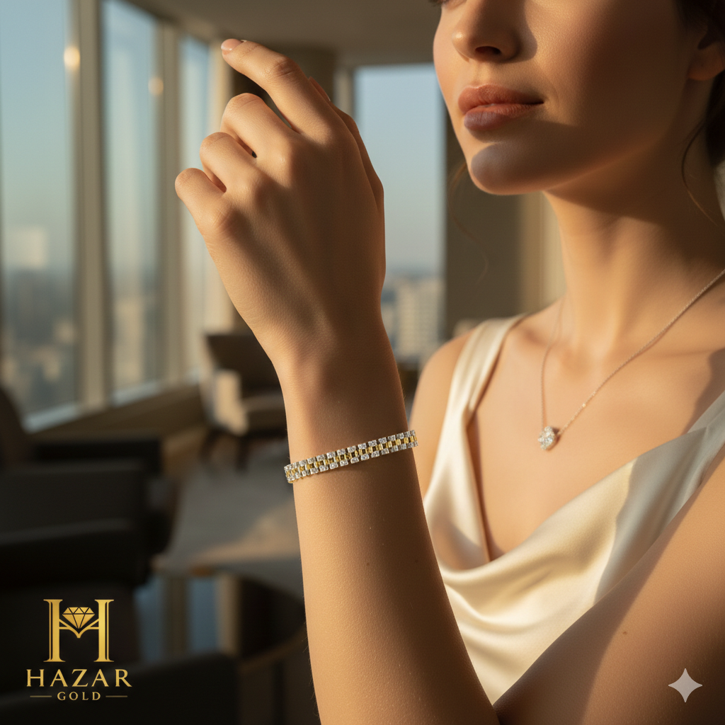 Modern tasarımın en güçlü ve zarif haliyle tanışın. Hazar Gold’un modern koleksiyonunun gözdesi olan bu geometrik bileklik، hem gücü hem de zarafeti bileğinde taşımak isteyen kadınlar için tasarlandı. Doğanın ham dokusuyla kusursuz bir kontrast oluşturan bu parça، her detayıyla lüksü yeniden tanımlıyor.