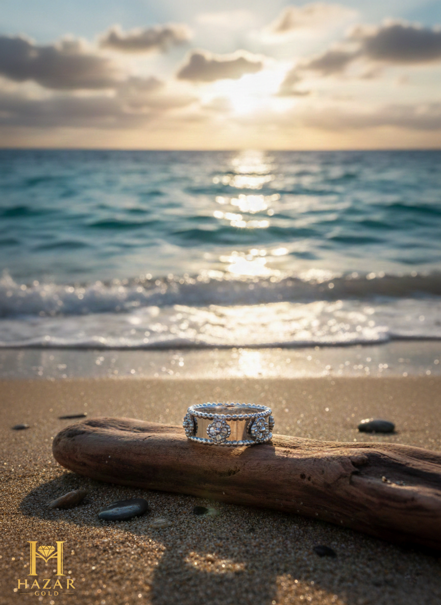 Deniz kıyısının dinginliğini ve güneşin parıltısını parmağınıza taşıyan bu özel tasarım, Hazar Gold‘un yüksek işçilik kalitesini yansıtıyor. Zarif çiçek motifleri ve modern dokusuyla, hem klasik hem de yenilikçi bir tarz arayan kadınlar için tasarlandı.